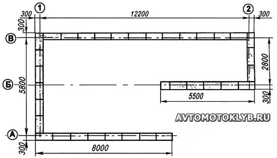 ![]() План фундаментов (материал — бетонные блоки ФБ1 размерами 1000x600x400 мм — длина х высота х ширина, 35 шт); А, Б, В, 1, 2 — строительные оси. |