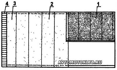 ![]() Гараж-мастерская (вид сверху): 1 — колея, 2 — ворота-крышка люка; 3 — покров (почвенно-растительный слой); 4 — лестница. |