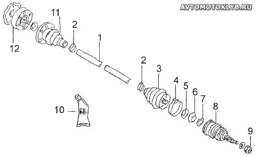 ![]() Рис. 1. Вал привода с шарниром равных угловых скоростей: 1 – вал привода; 2 – хомуты внутренние; 3 – пыльник внешнего ШРУСа; 4 – хомут внешний; 5 – коническая упорная шайба; 6 – проставка; 7 – запорное кольцо; 8 – внешний ШРУС; 9 – гайка; 10 – смазка; 11 – пыльник внутреннего ШРУСа; 12 – внутренний ШРУС. |