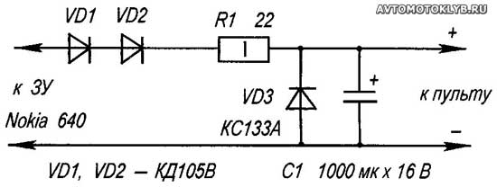 Диоды VD1, VD2 можно применить из серии КД105, Д220, КД213, 1N5401, 1N5407. На каждом из двух диодов падение напряжения в данной схеме составит 0,6 В. Стабилитрон VD3 (КС133А) можно заменить двумя включенными последовательно стабилитронами типа КС107А или аналогичными, рассчитанными на суммарное напряжение до 4 В. Применять здесь популярный стабилитрон типа КС139А нежелательно, так как его напряжение стабилизации имеет относительно большой разброс (до 4,2 В). Оксидный конденсатор С1 лучше применить зарубежный, например, фирмы Hitano или аналогичный — с малыми размерами и соответствующими (указанными на электрической схеме) параметрами. Резистор R1 — типа МЛТ. Он ограничивает ток. Его сопротивление находится в пределах 13—27 Ом, мощность рассеяния — 1 Вт. Элементы стабилизатора «прячутся» в том же корпусе брелока в месте, предназначенном для установки батарейки типа AAA.