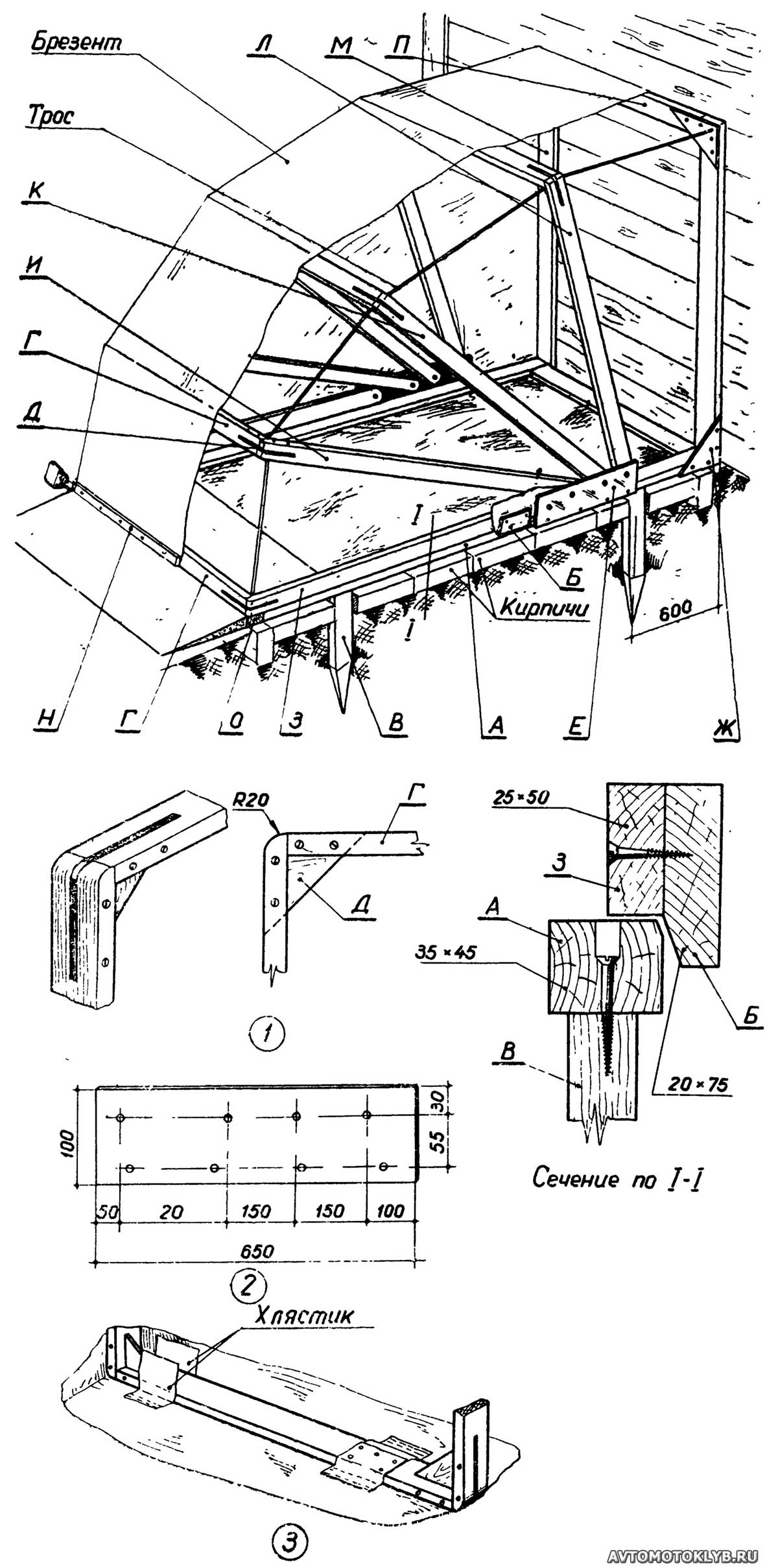 Гараж поможет лучше сохранить мотоцикл (скутер), уберечь его от вредного воздействия атмосферных осадков, позволит надежно укрыть его на время зимнего сезона, когда мотоцикл обычно не эксплуатируют. Складной гараж представляет собой деревянный каркас, состоящий из П-образного основания и поворотных рам, обтянутый водоотталкивающей тканью (брезентом, плащ-палаткой и др.). Собирается каркас с помощью металлических кронштейнов и болтов. Угловое соединение поворотных рам усилено врезными кницами. Вертикальная рама-основание крепится к любой стене. Под горизонтальную раму делают цементную подушку и прикрепляют к деревянным кольям, прочно забитым в землю.